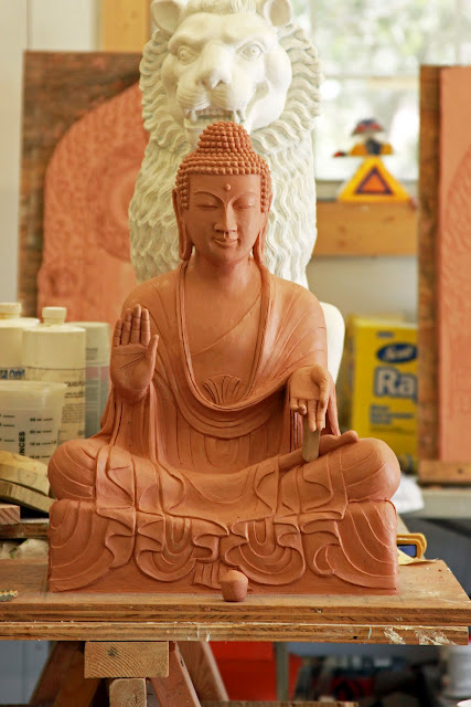 I was fortunate to be living at the monastery in 2011 in a little 8′ x 10′ cabin in the middle of a construction site. I often peaked into the workshop we had constructed for such projects to see the statues in various stages of completion, and was amazed at what was going on. I happened to know a fine arts professor at UT who checked out requested books for us in her name, books with large high-resolution photos of original statues. Contrary to expectation and fear, they were returned without clay prints.